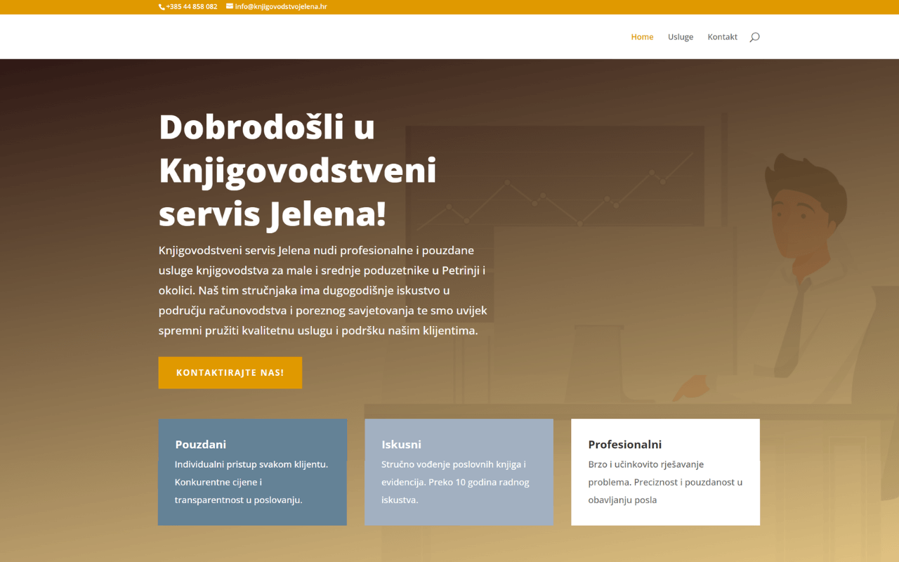 Stranica Knjigovodstvo Jelena opisuje računovodstvene usluge koje pruža tvrtka. Nude knjigovodstvo, pripremu poreza, obračun plaća i financijsko savjetovanje za mala i srednja poduzeća.